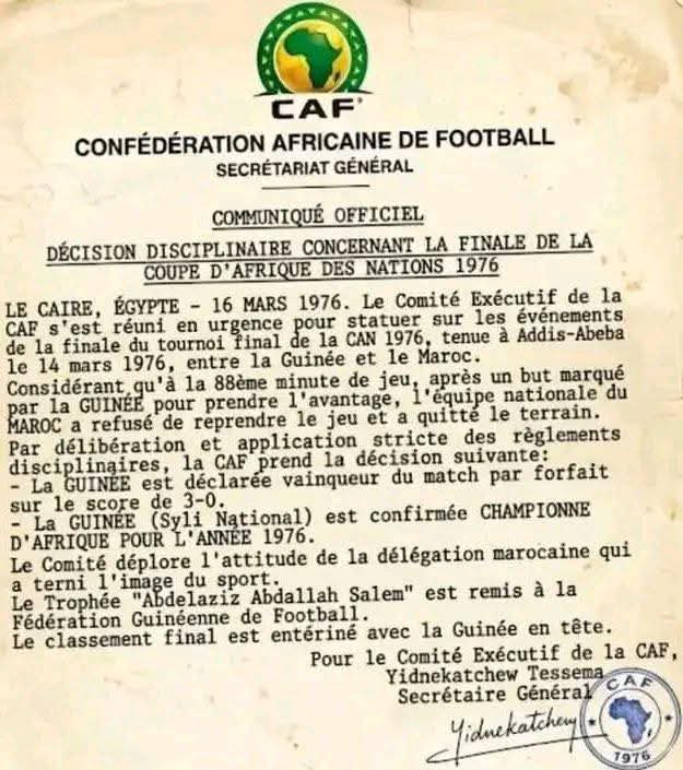 Le match décisif Guinée vs Maroc a eu lieu le 14 mars 1976 à Addis-Abeba. Il s’est terminé par un nul 1-1 (but de Chérif Souleymane pour la Guinée à la 33e, égalisation marocaine à la 86e par Baba).