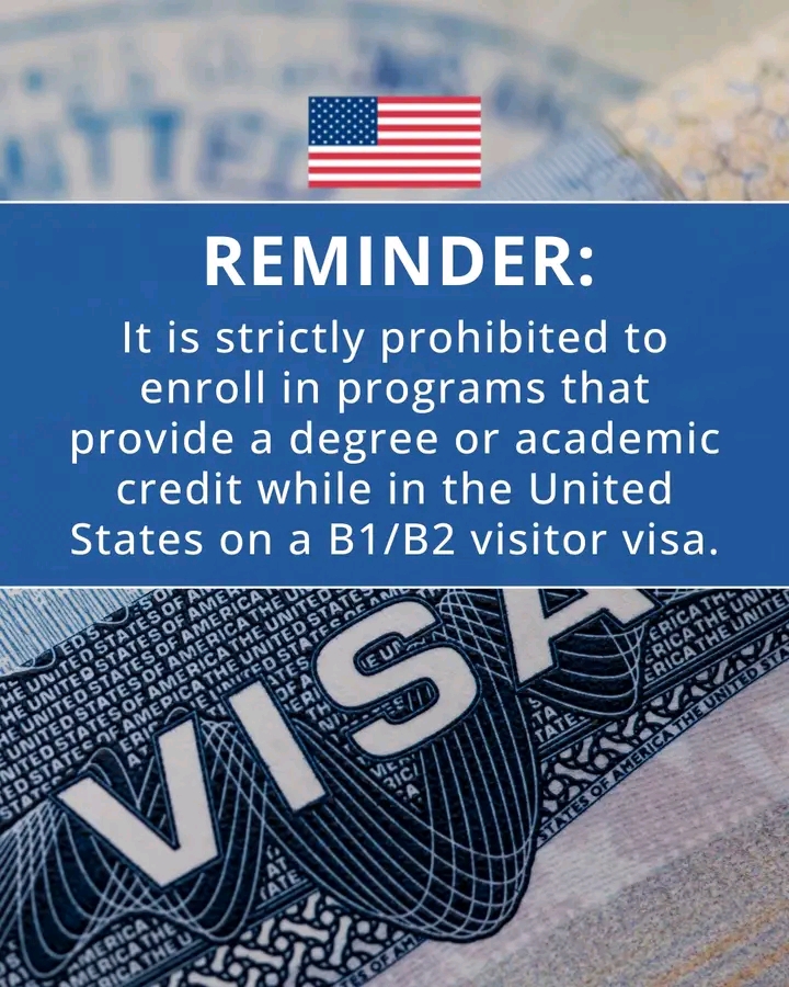 Reminder: It is strictly prohibited to enroll in programs that provide a degree or academic credit while in the United States on a B1/B2 visitor visa. Engaging in unauthorized use of a U.S. visa, even for a short amount of time, may result in a permanent ban from entering the United States in the future.