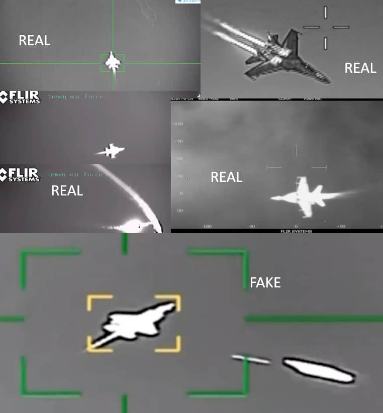 Comparez la différence avec des images réelles et authentifiées de chasseurs dans le ciel ( images ci dessus)