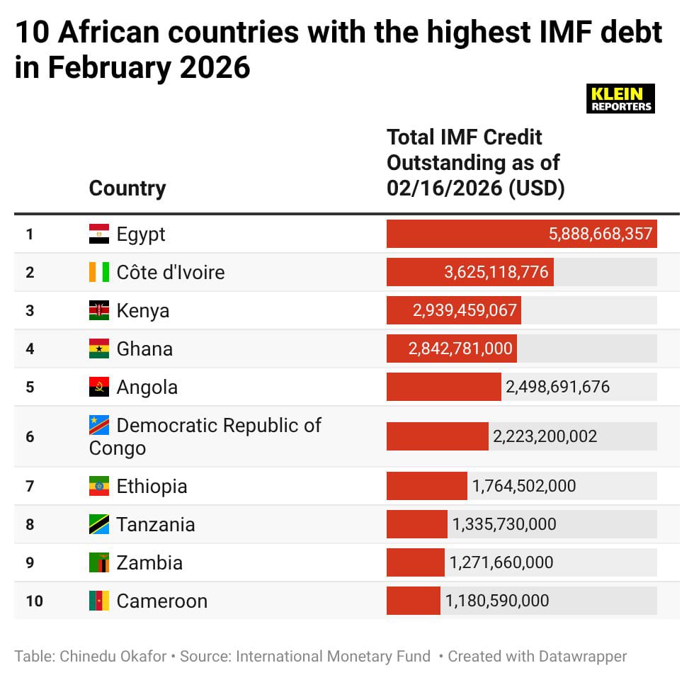 Voici la liste des 10 pays africains avec la plus grosse dette envers le FMI en février 2026 (données au 16/02/2026)
