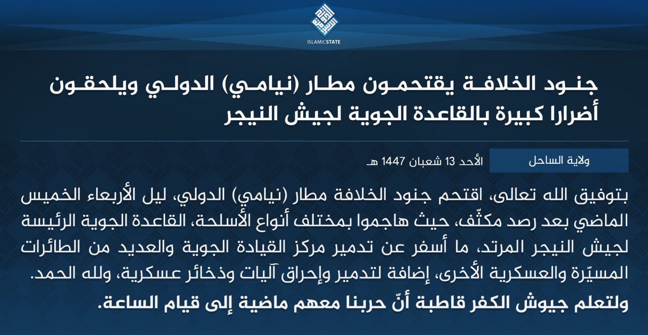 L’État islamique a déclaré que ses militants ont pris d’assaut l’aéroport international de Niamey, dans la nuit du mercredi au jeudi 29 janvier 2026, après une surveillance intensive.